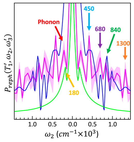 Figure 5 shows that the four peaks in the measured mean FT at = 450 cm−1, 680 cm−1, 840 cm−1, and 1300 cm−1 are caused by coherences in the dimer, as there are no monomer coherences in their vicinity.