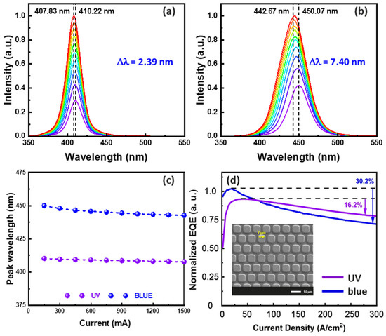 Optical and electrical properties of μ-LED devices under direct current were measured using a spectrometer (Maya 2000 Pro), where the emitted light was collected by an integrating sphere. When the input current density of the UV μ-LED using QW intermixing increased from 150 A/cm2 to 1500 A/cm2, the peak wavelength changed from 410.22 nm to 407.83 nm, corresponding to a blue shift of 2.39 nm. In contrast, the peak wavelength of the conventional multiple quantum well (MQW) blue μ-LED changed from 450.07 nm to 442.67 nm, exhibiting a blue shift of 7.04 nm. Consequently, the wavelength shift of the UV μ-LED is smaller under varying current measurements, as shown in Figure 4a–c. Regarding external quantum efficiency (EQE) performance, UV μ-LEDs display superior sag characteristics, as depicted in Figure 4d. This is due to the QCSE in the polar c-plane GaN, which results in an efficiency drop at low current densities. Nonetheless, thanks to the presence of a three-layer interleaved QW structure, the device experiences less efficiency degradation compared to conventional MQW blues, improving the conversion efficiency at higher injection currents [26].