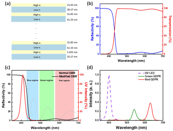 Although the use of QW-intermixing UV μ-LED as the excitation source for QD CCL can effectively enhance the device’s PLQY, the light leakage phenomenon cannot be completely avoided when utilizing a thinner film. The CCE can be used to evaluate this leakage, as it is a key photonic characteristic of the CCL. Pump LEDs output high-energy photons (in the blue or UV region) that are then absorbed by the active material inside the CCL and re-emitted as low-energy photons [10,22]. Therefore, to further suppress the light leakage, we designed a modified DBR on top of the overall structure. This is a reflector comprised of multiple alternating layers of materials with different refractive indices. In a multilayer structure with periodic contrast of high and low optical refractive indices, when each layer’s thickness equals one-fourth of the wavelength, partial reflection at each surface combines with phase length interference, allowing the multilayer to act as a high-quality, adjustable reflector in terms of reflectivity and bandwidth [25,34]. Ideally, a flat transmission spectrum with over 90% transmittance in the long wavelength range is required. We designed the modified DBR structure as the first pair of SiO2/TiO2 (35.165 nm/5.4250 nm) and the last pair of SiO2/TiO2 (30.165 nm/15.425 nm) for the calculated transmittance and reflectance spectra, as shown in Figure 8a,b. Compared to a conventional DBR, the modified DBR can reduce or even eliminate unwanted ripples, as shown in Figure 8c. Figure 8d demonstrates the EL of the modified DBR over the red and green QDPR, showing effective suppression of the UV. The CCE calculation by EL reveals that the CCE of red and green QDPR is 96.25% and 92.91%, respectively. This indicates that our improved DBR can effectively suppress UV light leakage without losing significant QD radiation.