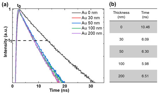 (a) Fluorescence decay curve of QDs with and without Au layers of different thickness. (b) Fluorescence lifetime of QDs with and without Au layers of different thickness. For all samples, a 10 nm SiO2 spacer layer was deposited over the Au layer.