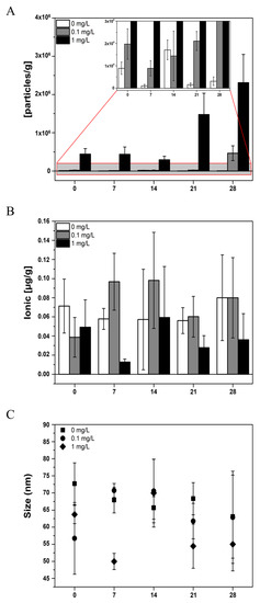 Sn NPs concentration shows a time and dose-dependent accumulation trend, reaching the highest level of 2.31 × 106 ± 9.05 × 105 NPs/g of dry weight in the last time point, after 28 days of exposure (Figure 3A). The high SD value could be attributed to the considerable number of dilutions performed prior to sp-ICP-MS analysis. Taking a look at the dissolved Sn concentration measured in the Nano configuration, the relatively low amount indicates that the technique is not responsible for NPs dissolution, and this could also be confirmed by the averaged particles’ size calculation (Figure 3B,C). It is also interesting to point out that there is no trend in dose or time-dependency on the ionic concentration, indicating that there is no significant dissolution of the ATO NPs in the mussel’s tissue. The presence of some NPs observed in the control condition could suggest that NPs that contain Sn in their composition were already accumulated into mussels at the starting time of the experiment.