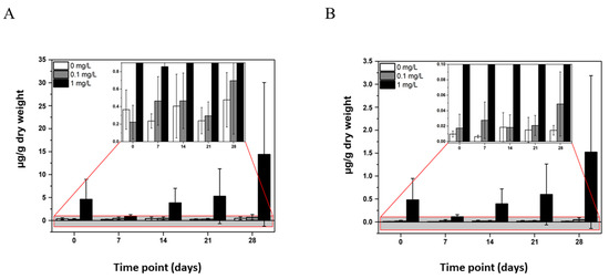 Total concentration of Sn (A) and Sb (B) at different time points after beginning of exposure, obtained after mussels’ alkaline digestion. Error bars correspond to the SD of three experimental replicates.