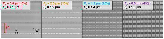 Scanning electron microscopy images of the fabricated metal metasurfaces patterned on SiO2 covered substrates. Metal thickness (50 nm), design width (200 nm), and nanogap distance (200 nm) were fixed, whilst the lateral pitch Py and horizontal metal lengths Lx were varied. From left to right, the density of metal antennas and coverage % are increased, whilst the horizontal metal lengths Lx were also slightly increased to compensate for Py-induced blueshifts and targeting CO2 (4.25 μm) with their peak photoresponse wavelengths.
