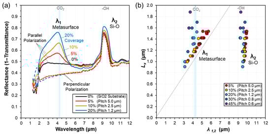 (a) Linear polarized micro-FTIR spectra of the fabricated metasurfaces shows two clear mid-infrared photoresponses peaks, λ1, λ2. Here, the metasurface photoresponses λ1 were targeted at the 4.25 μm absorption peak for CO2, with wavelength dependent peak interaction intensities increasing with the metal coverage. (b) Measured dependence of the peak-response wavelengths (λ1, λ2) on the designed metal length (Lx), for different array pitch (Py). λ1 can be attributed to the metal metasurface geometry and increases with metal length Lx whilst decreasing with sub-wavelength metal coverage densities (Pitch, %Metal). The dashed line follows the expected trend for isolated nanoantenna, derived in Section 3.3.