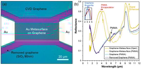 (a) Example optoelectronic hybrid graphene metasurface device patterned on a monolayer CVD graphene—SiO2 substrate, imaged by LUT contrast enhanced optical microscopy during processing []. (b) Micro-FTIR reflectance comparing the different material related photoresponse of different hybrid graphene metasurface optoelectronic device areas, measured in ambient conditions. The figure inset shows a blueshifted photoresponse peak with the addition of graphene, as measured for the same geometrical metastructures.