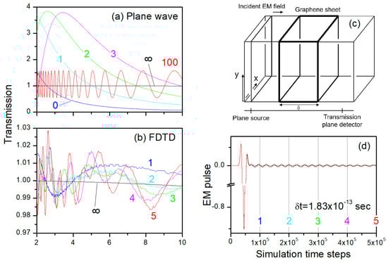 The critical aspect about results of Equation (6) and FDTD calculation is that Equation (6) is derived for a time interval of infinite length, i.e., n → ∞ in Equation (5). When we calculated the transmittance as a function of n, as a means to emulate measurements of finite time intervals, Equations (5) and (6) produced crests and troughs in the transmission spectrum (see Figure 4a), similar to the oscillations in Figure 4b. For the single graphene sheet, there existed a very substantial difference between n = 100 and n = ∞. This can be expected since the intensity of the IR wave in the graphene sheet will reduce gradually due to both the absorption (loss, ε′′ ≠ 0, but the real loss was negligibly small due to thin thickness) but mainly the transmission.