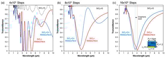 Figure 5 shows the transmittance spectra of the three sub-micron structures at three different simulation times. Because of the large dielectric coefficients of both the graphene sheet and the gold nanoantenna as well as the long wavelengths of interest (1∼10 μm), the transmittance spectra shown in Figure 5a strongly oscillated because the transmission detector in the simulation was placed within the residual electromagnetic fields captured around the graphene sheet and gold nanoantenna, diffracted from the z propagation direction to propagate along the x and y directions, which persist a long time since the sub-micron structures are periodic along the xy plane. Only after ~12 × 105 simulation steps, all transmitted EM field passed through the detector and the transmittance spectra converge (see Figure 5c). By comparison, here, we emphasised the technical importance of avoiding numerical artifacts for the system (Figure 5a,b).