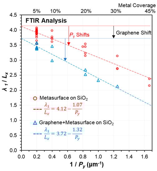 with extracted fitting parameters of A(SiO2-Au) ≈ 4.12, b(SiO2-Au) ≈ 1.07 for metasurfaces on SiO2 substrates. With the addition of graphene, we find A(SiO2-Au-G) ≈ 3.72, b(SiO2-Au-G) ≈ 1.32. From this, we can estimate neff(SiO2-Au) ≈ 2.06, and neff(SiO2-Au-G) ≈ 1.86. This pitch related shift effect can be quite substantial for subwavelength periodicities, e.g., for Py = 0.6 μm, ∆λ1 ≈ −40%.