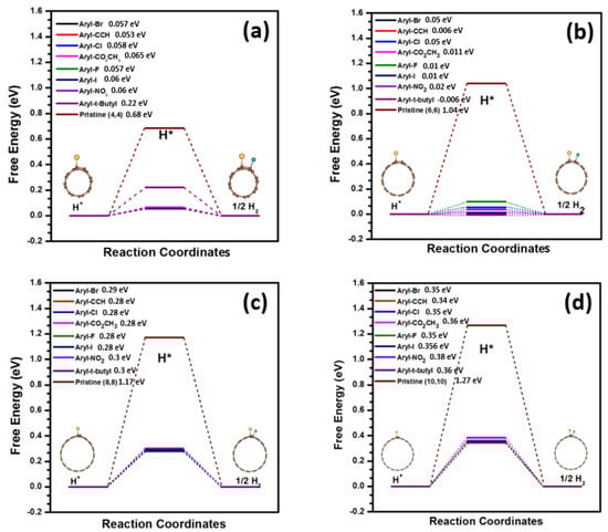 (a) The calculated free-energy diagram of the hydrogen evolution reaction, U = 0 V, under standard conditions for armchair (4,4) Aryl-L@SWCNT catalysts. (b) For armchair (6,6) Aryl-L@SWCNT catalysts. (c) For armchair (8,8) Aryl-L@SWCNT catalysts. (d) For armchair (10,10) Aryl-L@SWCNT catalysts. L = Br, CCH, Cl, CO2CH3, F, I, NO2, or t-butyl. The H adsorption active site was H1.