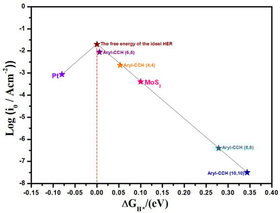 In the volcano-shaped diagram, the average Gibbs free energy of hydrogen adsorption (∆G0H*) on catalysts is used to calculate the theoretical exchange current, i0. Using Nørskov’s assumption [], if ∆G0H* = ≤ 0, the following expression for the exchange current at pH = 0 is applicable: