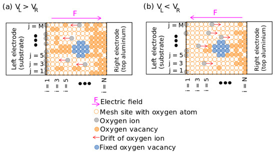 (a) Generation of oxygen vacancies and their (b) recombination. It is based on the deoxidation–oxidation model where oxygen ions drift into an oxide due to the electric potential difference between left () and right electrode ().