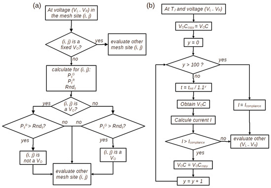 As we can see in Figure 3a, the stochastic process consists in the following: at each potential difference and current I, if the site is not a fixed or Si-NCs site (blue circles in Figure 2), the probability from (2), from (3) and a random number are calculated. If this site is a and the is greater than , the site passes to non-, which indicates it is not a . If the site is a non- and the is greater than , the site passes to a . In some cases, the RSM devices require a current compliance () to ensure reversible RS and to avoid severe damage in the active material [41]. The control of the current compliance is carried out at a new with temperature (Joule effect from previous values of current and voltage), as follows (Figure 3b): a copy of C is saved in ; then a new C, due to the initial time used when (Equations (2), (3) and (5)), is obtained by the stochastic process. Then, the current I is calculated for this new C. If the I is greater than , the is recovered and is reduced by a factor of where y increases in one unit. The same algorithm is repeated until or that be reduced to a factor of , assuming the C does not change and that the .