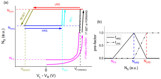 Different works have reported that the conduction mechanism depends on the resistive state, the RS material and the electrodes [43]. Based on the linear pre-factors for different resistive states proposed by Hu et al. [6], we use two factors, and that depend on and that multiply the current from different conduction mechanisms at HRS and LRS. These factors are defined by the piecewise functions shown in Figure 4b.