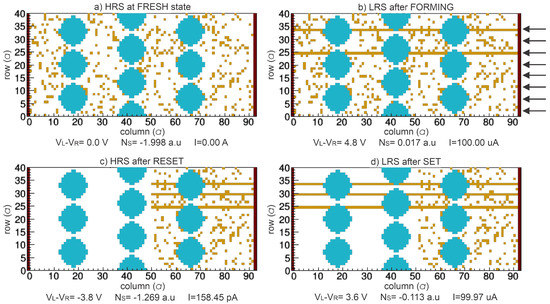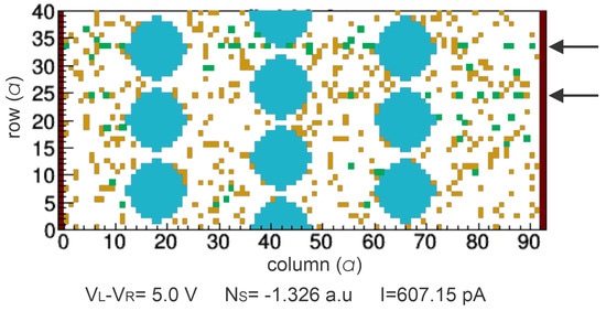 As we can see in the Figure 7b,d, the simulation of the FORMING process in both devices adjust to their experimental I-V data. The experimental FORMING process in the 1-BL device is observed as an abrupt change of current at V while the simulated one occurs at 3.8 V (Figure 7a,b). For the 3-BL device, the FORMING process exhibits an intermediate resistive state (IRS) level, Figure 7d, until the current increases to the highest current value at V (Figure 7c,d). As we can see, the simulated data fit well to the experimental data at the same . The experimental IRS is obtained when the current jumps from 1.61 pA at 4.4 V to 627.07 pA at 4.5 V. Figure 8 shows the simulation of the C in this current jump. As we can see, new s (green dots) are generated as the simulated voltage increases from 4.3 V (indicated by A in Figure 7d) to 5.0 V (indicated by B in Figure 7d). Then, the IRS level can be explained as a result of new , preferentially generated at rows and 34, as indicated by the arrows, which will form the complete CF to obtain the LRS (Figure 6b).