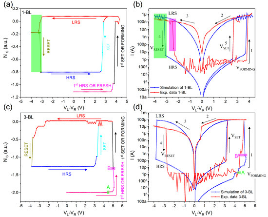 The simulation of the 3-BL device (Figure 7c,d) also shows the change from the HRS state to LRS (FORMING). This process occurs when the voltage sweep returns to 0V (sweep 2) at V, while the experimental FORMING is obtained for the voltage sweep from 0 V to 5.1 V (sweep 1) at V (Figure 7d). This difference between the experimental and simulated FORMING process can be explained by the stochastic nature of the RS phenomena [48].