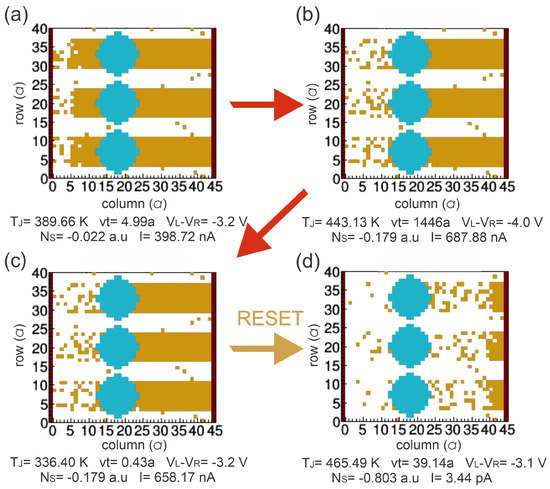 As we can see in Figure 7b, the experimental RESET process of the 1-BL device was obtained when the voltage is swept from V to 0 V (pink zone). The simulation of this process also shows the RESET at the same voltage sweep (green zone). Figure 9 shows the evolution of the Cs simulated for a voltage cycle from V to V (sweep 3) to V (sweep 4) to explain the RESET process for the 1-BL device. When the voltage increases from V to V (Figure 9a,b), the s near to the substrate (left electrode) recombine reducing the from a.u. at V to a.u. at V, but keep the device at the LRS. As we know, the Joule heating is an important parameter in the deoxidation–oxidation model. Then, a change in the temperature produced by the Joule heating affects the distance () that can travel. If v is high enough, the do not recombine with s. The v of the at V, as calculated by (1) increases due to a K. Therefore, the distance that can travel is about , which is higher than the thickness of the active layer (Figure 9b). The C remains unchanged as the voltage decreases from V to V (Figure 9b,c). However, the value decreases from K to K resulting in the decreasing of the distance that travel to . Consequently, the do not recombine with those s far away from the left electrode. As the voltage reduces from V to V (Figure 9c,d), an abrupt current drop is obtained from nA to pA (RESET). This strong current drop is related to an increased temperature from 336.4 K to 465.49 K, which results in a that allows the s to recombine, producing the RS from LRS a HRS (Figure 9d).