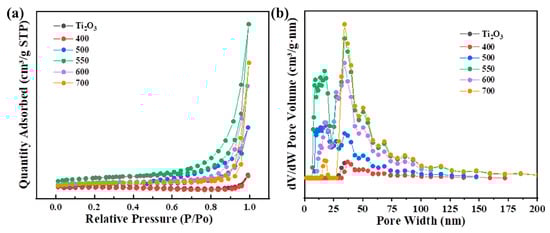 N2 adsorption–desorption experiments were conducted to investigate the effects of different temperatures on the specific surface area and pore size of the composite materials. Figure 6a shows that the specific surface area of the Ti2O3-550 is the largest, approximately 0.796 m2/g, which is about 12 times that of the original Ti2O3 (approximately 0.067 m2/g). The pore volume of the Ti2O3 significantly increased from 0.000467 cm3/g to 0.0058 cm3/g (Ti2O3-550), demonstrating the reconstruction of the microstructure of the material during the transition from Ti2O3 to TiO2. In addition, in the Ti2O3@TiO2 heterojunction system, the Ti2O3-700 bulk phase has the highest content of TiO2, although its specific surface area is not the largest. This phenomenon proves that the expansion effect of the specific surface area in the system does not originate from the TiO2. Therefore, the research results indicate that the temperature has significant control over the microstructure of the system. In addition, from the pore size distribution map (Figure 6b), it can be seen that the pore size of the original Ti2O3 is mainly distributed around 37.5 nm and 50 nm. With the increase in the heat treatment temperature, the Ti2O3@TiO2 heterojunctions generate new pore structures in the bulk phase after retaining the original pore structure of the material, with the pore sizes mainly being concentrated in the range of 18–20 nm. The results suggest that the microstructure of the Ti2O3 did not undergo significant changes during the heat treatment process.