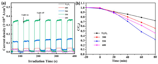 (a) Photogenerated current of the pure Ti2O3 and Ti2O3-400, Ti2O3-500, Ti2O3-550, and Ti2O3-600, and (b) the photocatalytic degradation performance of tetracycline.