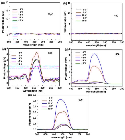 Surface photovoltage (SPV) diagrams of the Ti2O3 and Ti2O3/TiO2 heterojunctions: (a) Ti2O3, (b) Ti2O3-400, (c) Ti2O3-500, (d) Ti2O3-550, and (e) Ti2O3-600.