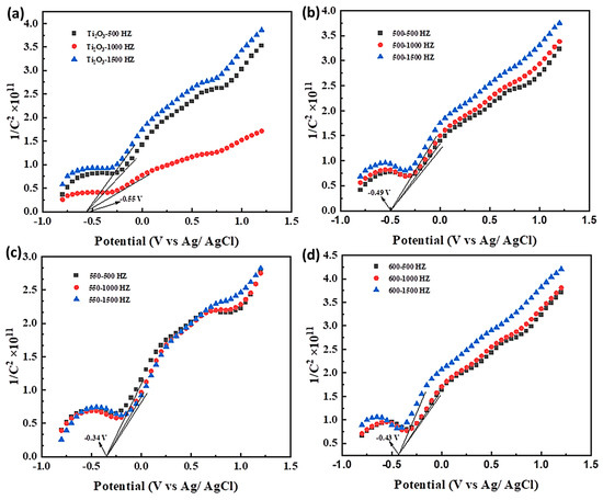 Mott–Schottky diagrams of the Ti2O3 and Ti2O3/TiO2 heterojunctions: (a) Ti2O3, (b) Ti2O3-500, (c) Ti2O3-550, and (d) Ti2O3-600.