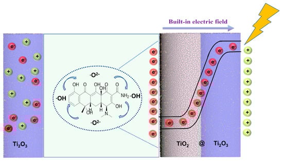 These experimental results indicate that under visible light irradiation, the photocatalytic reaction of the Ti2O3@TiO2 heterojunction is direct photocatalysis, where electrons are excited by visible light from the valence band of the TiO2 to the transition band of the Ti2O3, which is lower than the conduction band of the TiO2. Then, electrons can easily transfer from the Ti (III) site to the adjacent Ti (IV) sites through the valence excitation process [22]. Under visible light irradiation, photogenerated holes are injected into the conduction band of the photocatalyst by the built-in electric field. Subsequently, electrons are captured to produce reactive substances and induce degradation reactions (Figure 11).