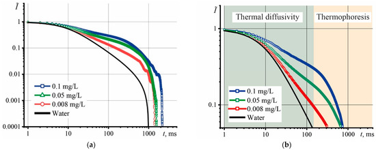 The shape of the transient curves demonstrates the presence of thermophoresis, which increases its influence with increasing concentration. An increase in the characteristic time occurs before the onset of thermophoresis, which appears after 150–200 ms and does not affect the determination of D (Figure 2b). The section up to 150 ms is responsible for thermal diffusivity and is used to determine D with a minimum systematic error. The behavior of the transient curves of GO dispersions (Figure 2a) indicates slow heating and a longer time to reach the steady state. As the concentration increases to 0.1 mg/L, the time to reach the steady state increases, which indicates a longer time to reach thermal equilibrium. Hence, it can be assumed that GO dispersions exhibit good thermal insulation properties at a concentration level of 0.1 mg/L.