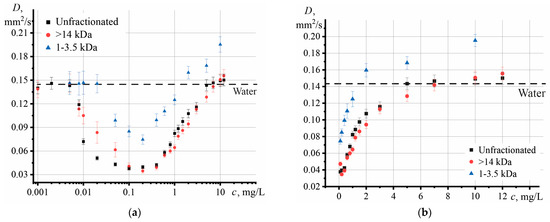 - The contribution of particles with different molar masses to the increase in thermal diffusivity, which was observed at c > 0.1 mg/L, is comparable with each other.