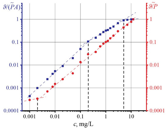 Figure 4 shows the dependences of the concentration of unfractionated GO on the thermal lens signal (found by Equation (5)) in two forms: red is the ratio of the thermal lens signal to the power of the excitation laser ϑ/P, and blue is the ratio of the thermal lens signal to the power and absorbance of the samples ϑ/(PA). It was found that the ϑ/P signal curve changes the nature of its dependence with increasing concentration at c > 0.005 mg/L, where a linear increase for ϑ/(PA) is observed. On the other hand, three regions can be distinguished for the thermal lens signal ϑ/(PA) with increasing concentration. The first change in linearity is observed at a concentration of 0.2 mg/L. At c > 7 mg/L, the second change in the dynamics of the signal occurs, where the signal reaches a constant value, repeating the dynamics of thermal diffusivity.