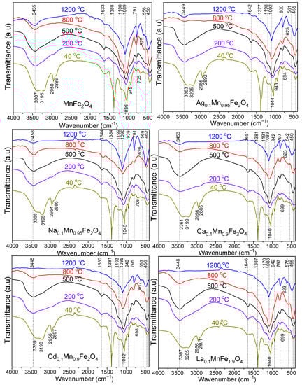 The functional groups, molecular geometry and inter-molecular interactions remarked in the FT–IR spectra of undoped and doped MnFe2O4 thermally treated at 40, 200, 500, 800, and 1200 °C are presented in Figure 1.