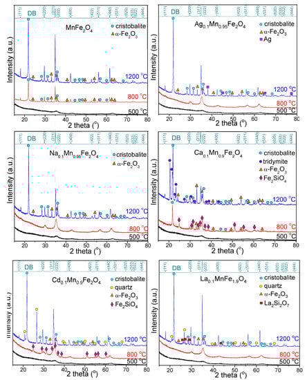 XRD patterns of MnFe2O4, Ag0.1Mn0.95Fe2O4, Na0.1Mn0.95Fe2O4, Ca0.1Mn0.9Fe2O4, Cd0.1Mn0.9Fe2O4, and La0.1MnFe1.9O4 gels annealed at 500, 800, and 1200 °C.