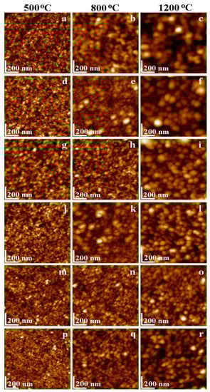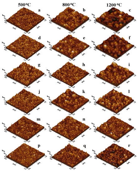 All ferrite nanoparticles released into the aqueous solutions are well individualized and were adsorbed uniformly onto the glass slide forming well-structured compact thin films. Depending on the annealing temperature, different topographies were remarked. In the case of gels annealed at 500 °C, the nanoparticles form a very thin uniform film with heights of 8 to 12 nm (Figure 4a,d,g,j,m,p) and low (0.5–1.34 nm) surface roughness (Table 2). The roughest film was obtained by the undoped MnFe2O4 and the smoothest for La3+ doped MnFe2O4 nanoparticles. Thin films obtained by the adsorption of the Na+, Cd2+, and La3+-doped MnFe2O4 nanoparticles annealed at 800 °C (Figure 4h,n,q) are compact and smooth, dominated by relatively small particles uniformly distributed on the film surface (Table 2). The other gels annealed at 800 °C present a few big particles mixed between the average-sized ones, generating a relatively irregular surface (Figure 4b,e,k) with increased roughness (1.6–3.8 nm, Table 2). Bigger nanoparticles resulted after annealing at 1200 °C form a uniform, compact and well-structured thin film with relatively irregular topography (Figure 4c,f,i,l,o,r) and relatively high surface roughness (2.28–4.78 nm, Table 2). Doped MnFe2O4 thin films with similar roughness were obtained by various methods, such as sputtering [], spin coating [], and spray pyrolysis [].