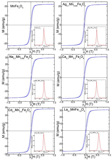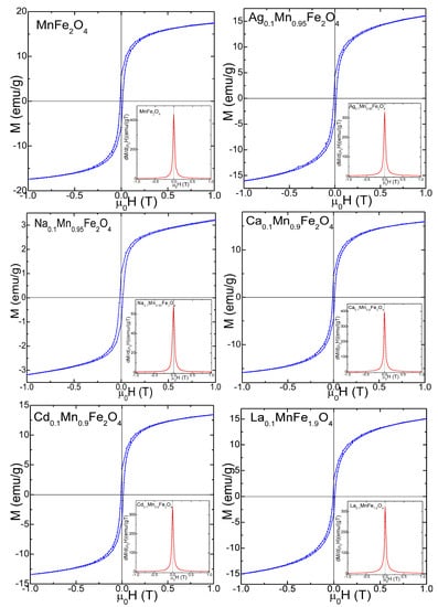 Magnetic hysteresis loops and the magnetization first derivatives MnFe2O4, Ag0.1Mn0.95Fe2O4, Na0.1Mn0.95Fe2O4, Ca0.1Mn0.9Fe2O4, Cd0.1Mn0.9Fe2O4, and La0.1MnFe1.9O4, gels annealed at 1200 °C.