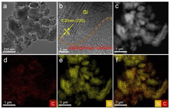 (a) TEM, (b) HRTEM, (c) HAADF, and (d–f) elemental mapping images of Si@CPpy-2.