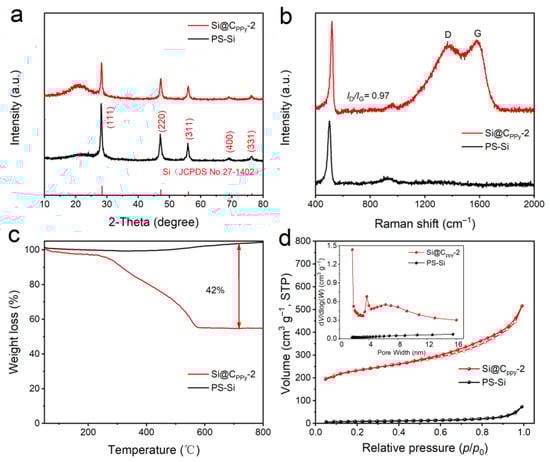 (a) XRD patterns, (b) Raman spectra, (c) TGA curves, and (d) N2 adsorption–desorption isotherms with the pore size distribution of PS-Si and Si@CPpy-2.