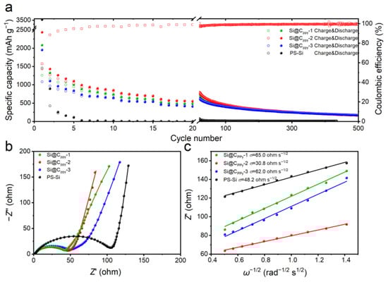 Electrochemical performance of Si@CPPy electrodes in lithium-ion half-cells. (a) Rate and cycling performance. (b) Nyquist plots. (c) Fitting Z′ and ω−1/2.