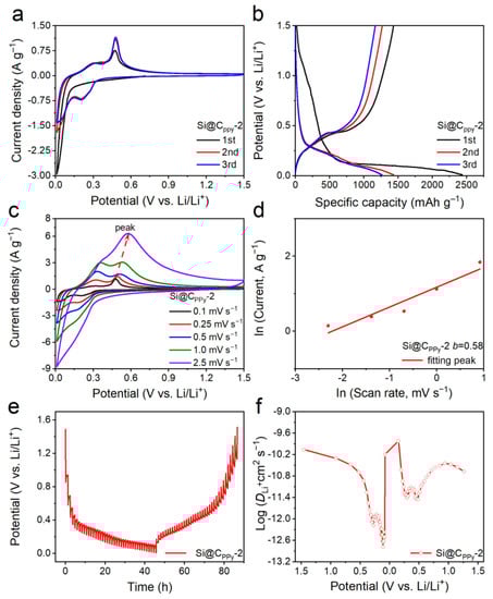 It is worth pointing out that b = 0.5 indicates diffusion-controlled reactions, while b = 1 means surface-controlled reactions. As shown in Figure 4d, the b value of the Si@CPPy-2 composite is 0.58, which is closer to 0.5, suggesting that the diffusion-dominating process controls the lithium storage dynamics.