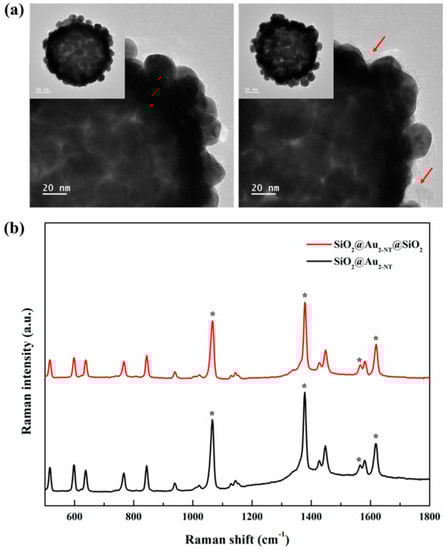 TEM images of (a) SiO2@Au2-NT (left) and SiO2@Au2-NT@SiO2 (right). The red arrow indicates the silica shell. (b) Raman spectra of SiO2@Au2-NT and SiO2@Au2-NT@SiO2. The “*” indicates the representative peaks of 2-NT.
