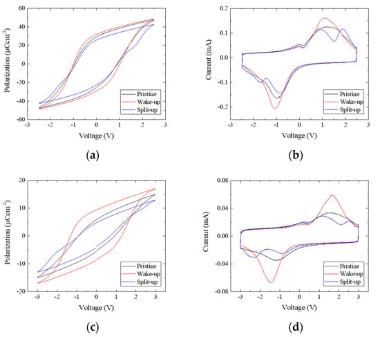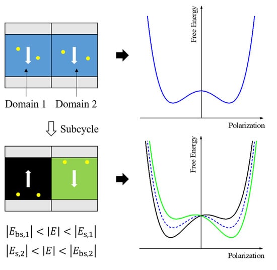 Oxygen vacancies play a critical role in their evolution since they move or are generated under switching cycles. These induce wake-up and fatigue phenomena, indicating the increment and the decrement in the , respectively [14,16]. Studying the split-up effect, which causes the pinching of the P–V loop, is helpful for understanding the movement of oxygen vacancies. Schenk et al. reported that oxygen vacancies are affected by the electric field induced by the polarization state in the static domain during a subcycle, and that the split-up effect can be induced by various local domain free energy landscapes [15,16]. The oxygen vacancies inside the domain affect the free energy landscape of the domain. Various domains with different polarization states and oxygen vacancy distributions contribute to different free energy landscapes. If the landscapes have two distinct tendencies, the split-up effect occurs when the entire thin film is switched.