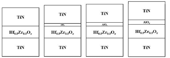 Ten-nanometer-thick hafnium zirconium oxide (HZO) films were grown on a TiN-coated Si substrate, and subsequently, the aluminum oxide (AO) layers with thicknesses varying from 0 to 3 nm were deposited using atomic layer deposition. The fabricated devices consisted of the structures as Figure 2. The AO was deposited in situ after HZO was deposited to prevent the external impurities. The deposition temperature for the AO was 300 °C in that the HZO was deposited due to the good thermal stability of the trimethylaluminum we used. TiN top electrodes were deposited by sputtering using a shadow mask. To achieve the ferroelectricity of the HZO, all the samples were annealed at 600 °C for 1 min using a rapid thermal process.