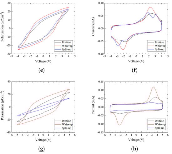 Figure 5 shows the switching density distributions in all the samples. The distribution changes in the MIFM capacitors follow a trend similar to those in the MFM capacitors. In the wake-up state, the maximum switching density increased, while the width of the distribution was maintained. This indicates that more domains participated in switching. In the split-up state, the peak of the switching density split into two peaks with the different values in a similar manner to the I–V curve. One peak is the more negative , and the other is around zero. This is because the samples in the pristine state already had a negative , and the bias fields maintained the negative values for the wake-up. In other words, the switching density peak in the wake-up is split into two peaks in opposite directions on the -axis.