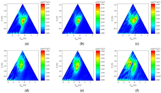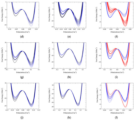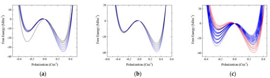 Figure 6 shows the free energy landscapes of the local domains for all the samples. and were used when the corresponding switching densities exceeded 60% of the maximum switching density because they were most actively involved in switching. In Figure 5, colors ranging from black to blue denote the different landscapes in the pristine and wake-up states. The landscapes of the domains in these states exhibited similar tendencies and changed gradually. The landscapes in blue and red are based on the bias features in the split-up state.