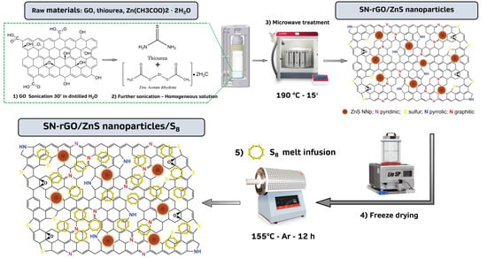 2.3. Preparation of the SN-rGO/S, SN-rGO/ZnS/S Cathodes and SN-rGO, SN-rGO/ZnS, KjB Electrodes