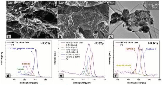 (a) FESEM micrograph of SN-rGO sample; (b) FESEM micrograph of SN-rGO/ZnS sample, where the ZnS particles are clearly visible on the surface of the doped rGO; (c) TEM micrograph of SN-rGO/ZnS, with particular focus on the ZnS nanoparticles and their crystalline fringes and interplanar (111) distance in the inlet in the upper right corner; (d) XPS C1s high-resolution spectra; (e) XPS S2p high-resolution spectra; and (f) XPS N1s high-resolution spectra of the SN-rGO/ZnS sample.