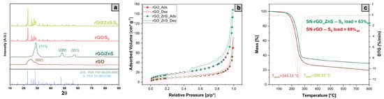 The characterization of the pristine SN-rGO and SN-rGO/ZnS was completed utilizing XRD, BET and TGA techniques, which were also used to study the two materials after they had been loaded with sulfur in the tubular oven (Figure 1). The infiltrated samples are referred as SN-rGO/S and SN-rGO/ZnS/S. The XRD spectra of the SN-rGO and SN-rGO/ZnS, reported in Figure 3a do not present any signal at 2 = 10.6 which is ascribed to the (001) lattice plane corresponding to a d spacing of 0.83 nm in GO, thus certifying the reduction of GO during the microwave synthesis. In the SN-rGO sample, thanks to the removal of oxygen-containing groups, a broad diffraction peak (002) between 21° and 30° appears, corresponding to a d-spacing of 0.38 nm [51]. Finally, in the SN-rGO/ZnS spectra is evident the presence of a crystalline phase that was identified by the typical positions at 28.5°, 47.6° and 56.3° of the (111), (220), and (311) lattice plans of ZnS, respectively. The XRD spectra of the two rGO infiltrated with sulfur, reported in the upper part of Figure 3a, are very similar to each other due to the clear presence of sulfur patterns that cover the peaks of the two pristine materials.
