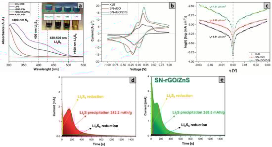 (a) UV-VIS analysis of the pure DOL:DME LiS 0.5 mM solution and supernatants of the same solution after being in contact with SN-rGO and SN-rGO/ZnS; (b) cyclic voltammetry of the symmetrical cells (both electrodes of KjB, SN-rGO and SN-rGO/ZnS) performed at 5 mV s; (c) Tafel plots of the LiS solution redox on KjB, SN-rGO and SN-rGO/ZnS materials, derived from positive and negative LSV scans; (d) current transients obtained during the potentiostatic step of the LiS deposition test the for SN-rGO; and (e) for the SN-rGO/ZnS.