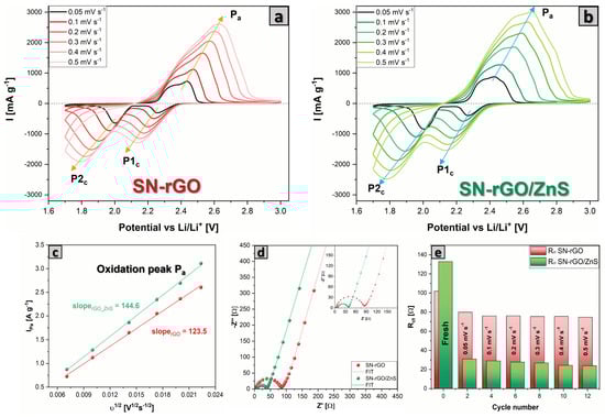(a) CV of the SN-rGO/SS-based cathode at different scan rate, (b) CV of the SN-rGO/ZnS/SS-based cathode at different scan rate, (c) linear plot of the maximum current peak P for both SN-rGO/S and SN-rGO/ZnS/S vs. the square root of the scan rate, (d) EIS spectra of SN-rGO/SS and SN-rGO/ZnS/S with the relative fitting, performed after the CV at 0.05 mVs, (e) comparison of the R values for the two different materials recorded at 2.8 V after the second cycle of CV at each different scan rate.