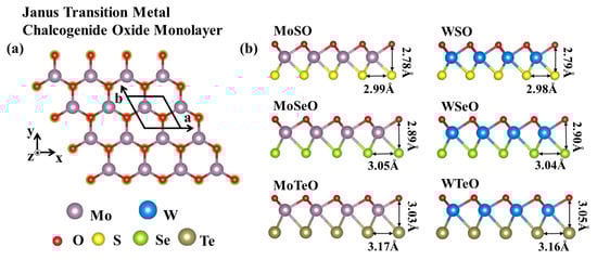 - Varjovi, M.J.; Yagmurcukardes, M.; Peeters, F.M.; Durgun, E. Janus Two-Dimensional Transition Metal Dichalcogenide Oxides: First-Principles Investigation of W X O Monolayers with X = S, Se, and Te. Phys. Rev. B 2021, 103, 195438. [Google Scholar] [CrossRef]