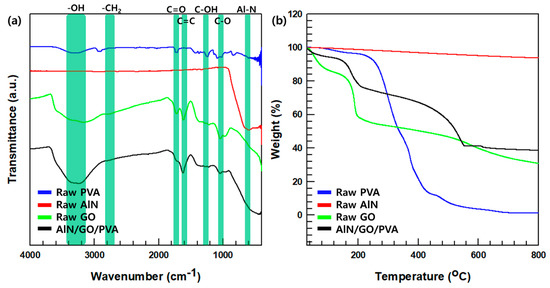 Analysis for raw PVA, raw AlN, raw GO and AlN/GO/PVA. (a) FT-IR spectra. (b) TGA curves of materials.