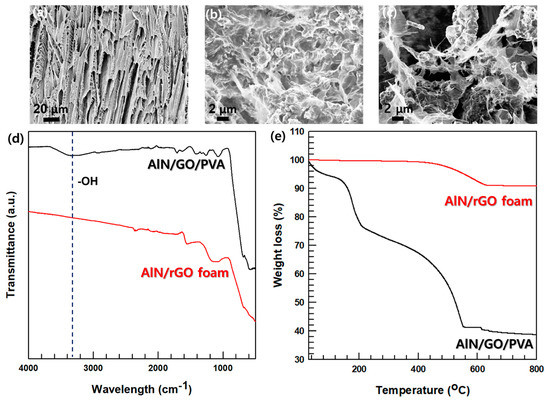 FE-SEM Images of composites; (a) PVA foam, (b) AlN/GO/PVA, (c) AlN/rGO foam. Analysis of AlN/GO/PVA and AlN/rGO foam; (d) FT-IR, (e) TGA.