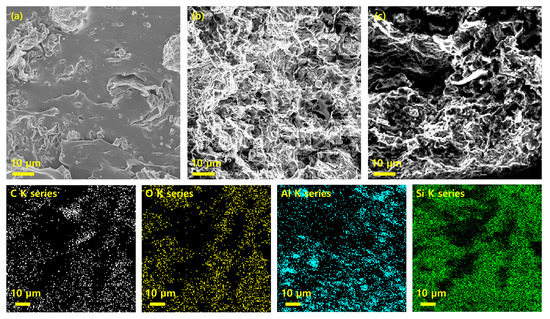 Figure 5a,b shows FE-SEM images of AlN/rGO/PDMS. As shown in Figure 5a (at a 2.08 × 103 magnification), the AlN/rGO/PDMS composite fabricated by random dispersion is generated indiscriminately without forming a network. Furthermore, the aggregation of the hybrid fillers occurred, which is the main factor hindering the improvement of thermal conductivity. On the other hand, in Figure 5b (at a 2.51 × 103 magnification), filler foam formed through freeze-drying and annealing processes can be found in composite materials and improves thermal conductivity by forming a three-dimensional heat transfer path. To confirm that the filler network was maintained, the EDS mapping image of AlN/rGO/PDMS was analyzed (Figure 5c). The even distribution of Si elemental confirms the successful infiltration of the PDMS matrix via vacuum-assisted infiltration. The presence of C, O, and Al elements, which are the main components of the AlN/rGO foam, indicates a similar pattern, verifying that the 3D structure through the freeze-drying and annealing process is well-executed. These results demonstrate the successful and uniform construction of the 3D foam structure within the matrix, allowing for the formation of an efficient thermal pathway.